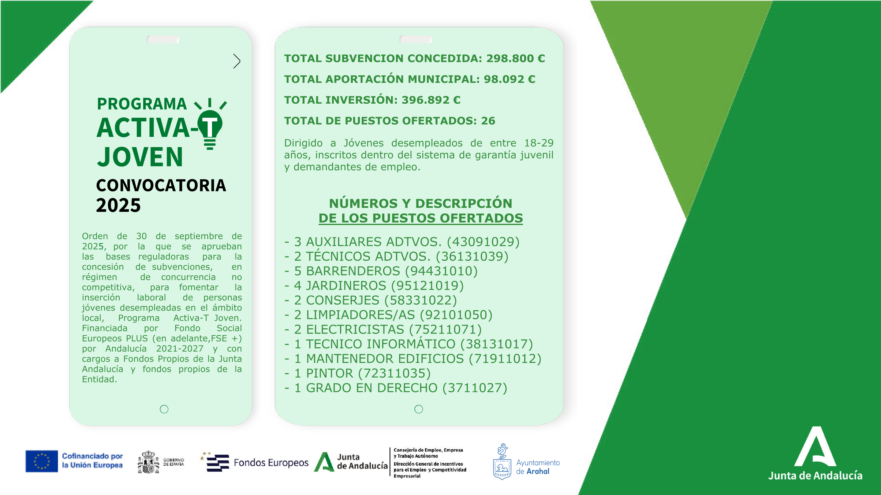 Orden del 30 de septiembre de 2025, por el que se aprueba las bases reguladoras para la concesión de subvenciones, en régimen de concurrencia no competitiva, para fomentar la inserción laboral de personas jóvenes desempleadas en el ámbito local. Financiada por Fondo Social Europeos PLUS (en adelante,FSE +) por Andalucía 2021-2027 y con cargos a Fondos Propios de la Junta AndalucÍa y fondos propios de la Entidad.