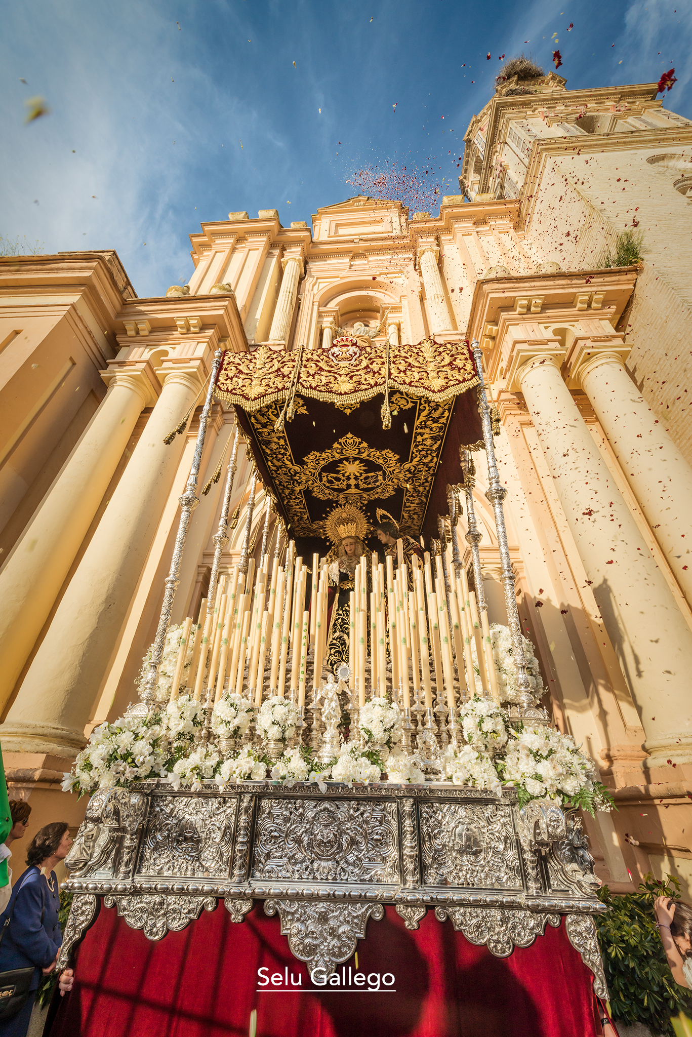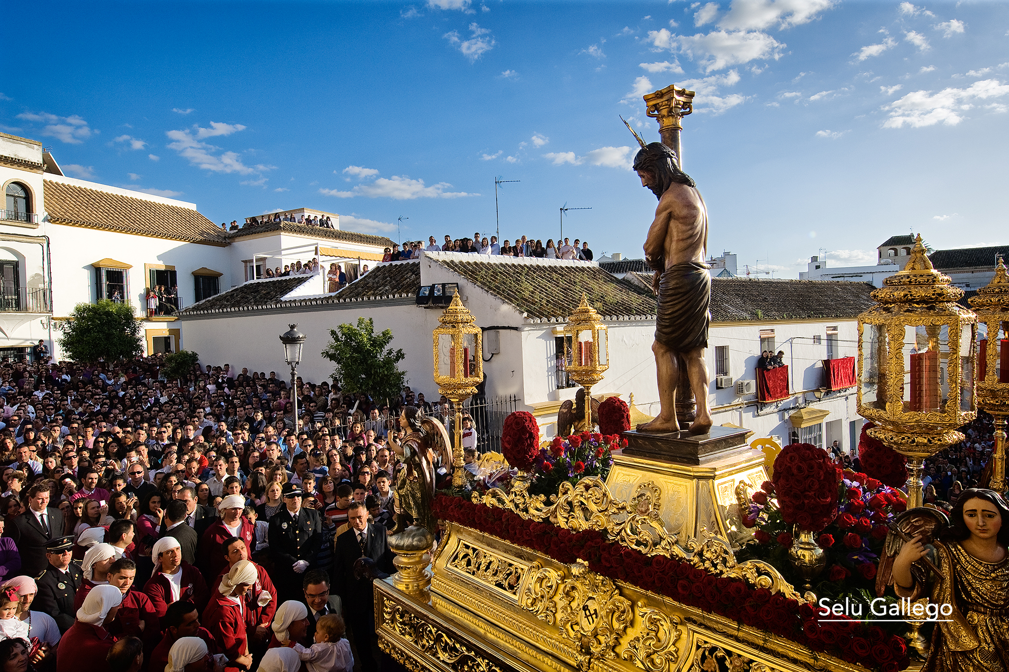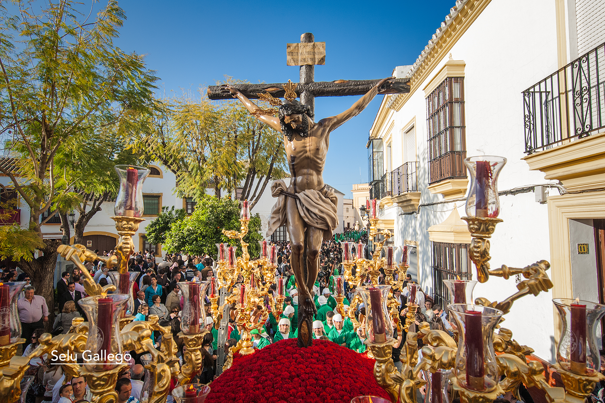 EXORNO FLORAL: claveles rojos en el Cristo y flores blancas en el palio.